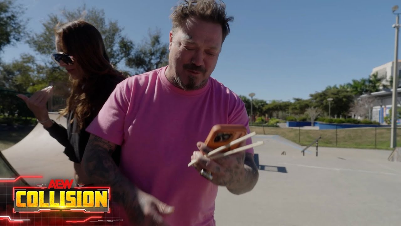 Fresh off absorbing severe punishment in the ring, Darby showed no hesitation getting back on a skateboard. Bam watched footage of Darby being suplexed into steel steps and laughed as the two bonded over their shared appetite for chaos.