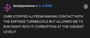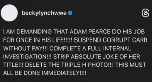 Her posts escalated as she demanded that Adam Pearce suspend Carr without pay and conduct a full internal investigation. Lynch also referenced the exposed turnbuckle sequence, arguing that the situation was handled inconsistently.