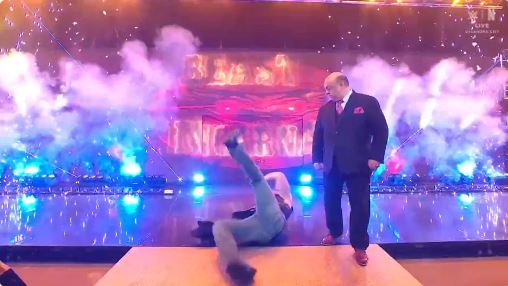 – Brock Lesnar slipped during his entrance but continued the post match brawl