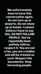 “We unfortunately have to have this conversation again,” Punk wrote. “Do not turn up at airports. Do not show up at hotels. I cannot believe I have to say this. DO NOT FOLLOW PEOPLE.”