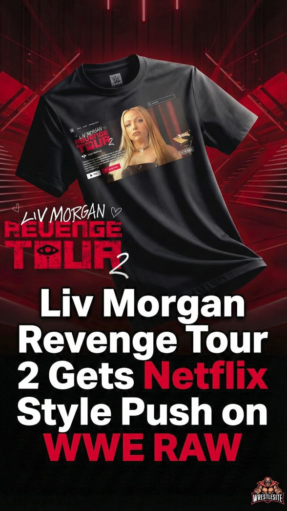 During RAW’s Netflix anniversary episode, WWE Shop released a new “Liv Morgan Revenge Tour 2” t-shirt. The design used a Netflix-style movie poster aesthetic, directly tying Morgan’s presentation to the streaming era of RAW.