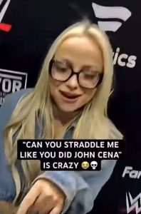 The fan approached Morgan and asked if she could straddle him “like you did John,” referring to the Survivor Series: WarGames moment where Morgan low blew John Cena during a major storyline twist. Morgan reacted instantly, recoiling and responding with a firm, “Nooo! Why?!” Her expression made clear she was caught off guard and not amused by the comment.