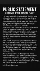 – The Rotunda family thanked fans for their support and asked for continued privacy