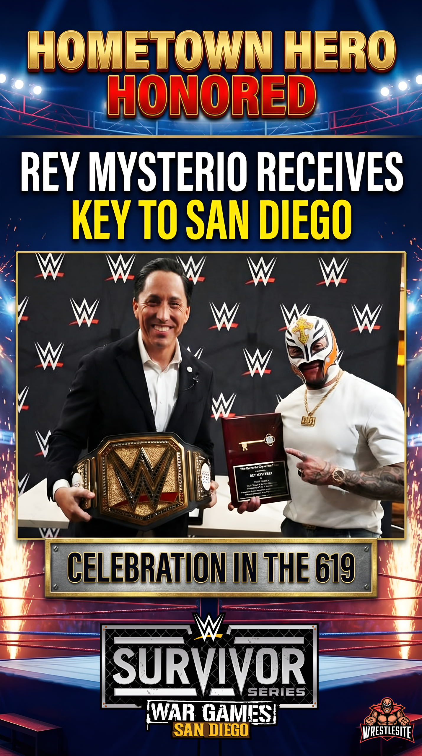 The Survivor Series WarGames weekend became more than just a major WWE event for San Diego. It turned into a civic celebration as Mayor Todd Gloria honored three of WWE’s hometown stars with the City’s highest recognition. Rey Mysterio, Nia Jax, and Dominik Mysterio each received the Key to the City during a ceremony held inside Petco Park ahead of the show.
