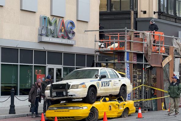 Nearby, a striking prop setup featured a crushed yellow New York City taxi stacked beneath a weathered NYPD patrol car, evoking the series’ signature look of urban collapse. The visual chaos drew plenty of attention from passersby and fans alike.
